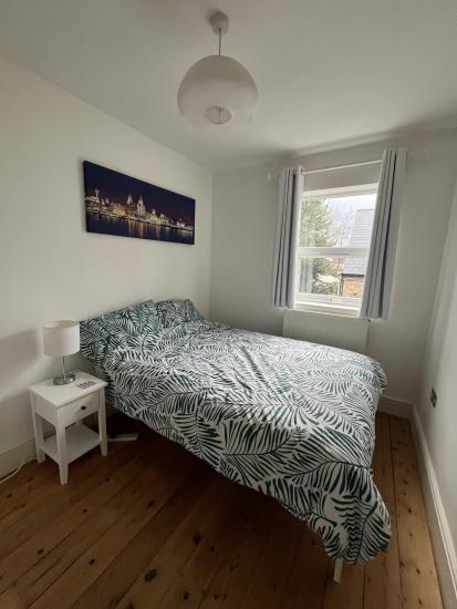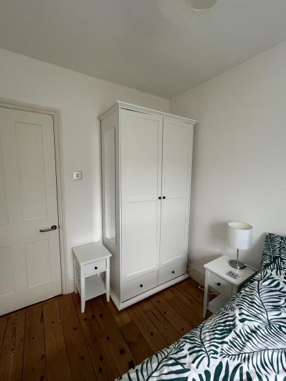 Room is good size with wooden floorboards, double bed, bedside table, full-length mirror and wardrobe with drawer and hanging space. Very light and quiet, at back of house with view onto garden.