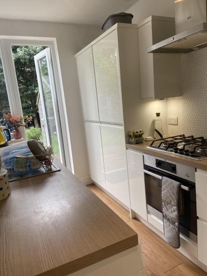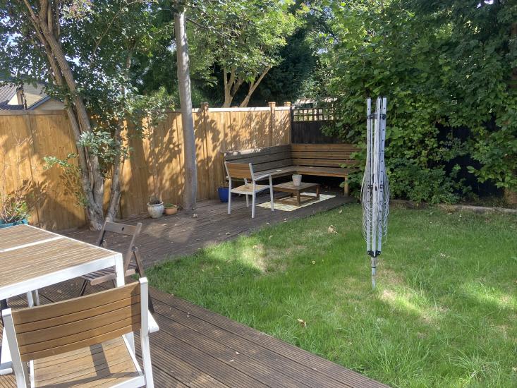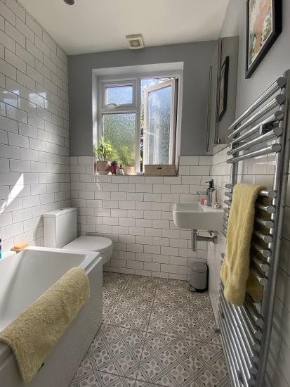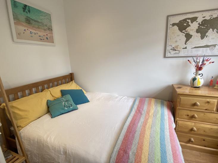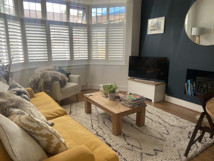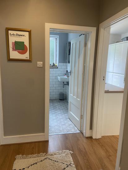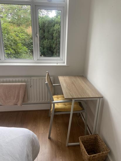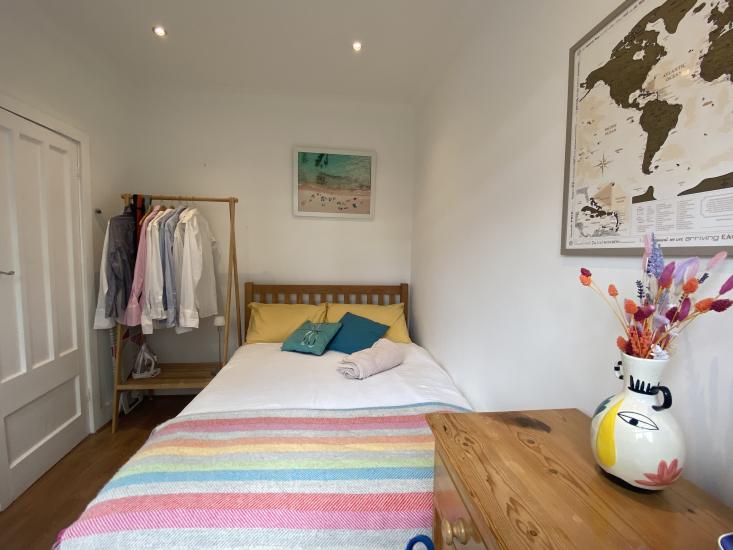 The room is a clean, comfortable double bedroom at the front of the house (downstairs flat). It has a desk and chair, chest of drawers, clothes rail and bedside lamp. There’s a front garden directly outside the windows downstairs, so good space between bedroom and street pavement. It’s a bright room and flat, with a cosy living room with dining table. A small kitchen goes out to the medium sized garden. The garden has nice outdoor seating and is a lovely calm space. There is one bathroom, with a decent shower and a bath.