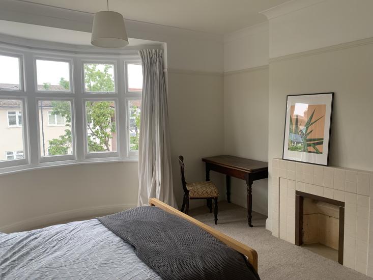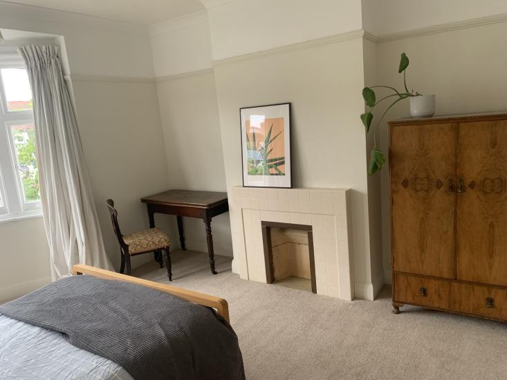 The very large double room is furnished with a double bed, bedside table and lamp, desk and chair and wardrobe. It also has a fireplace (not useable) and a bay window. Bills are included in the price.
