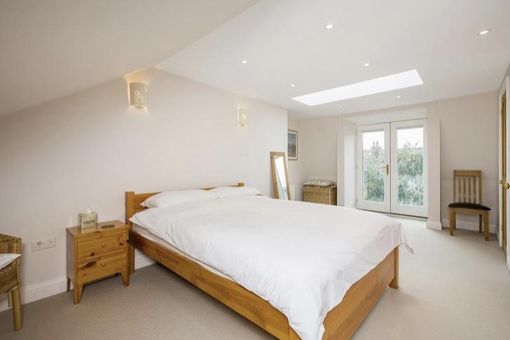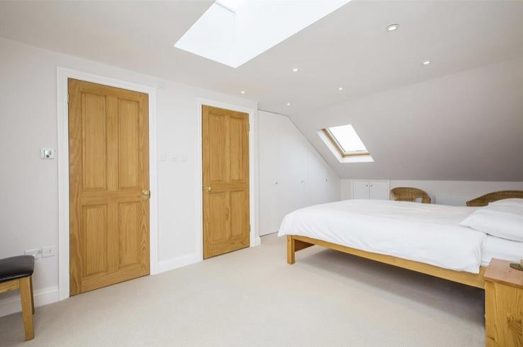 The large double bedroom is on the top floor of a family home.