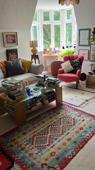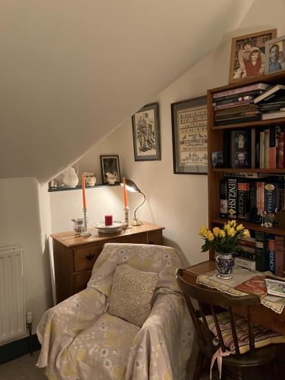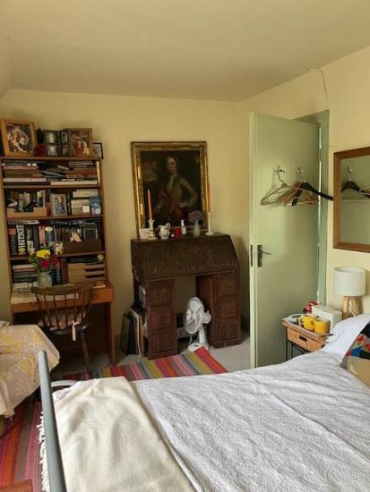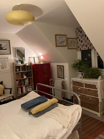 Comfortable double bedroom in attic flat, quiet location, shared use of bathroom and kitchen with vintage actress resident, still working. Artistic ambience, not minimalist