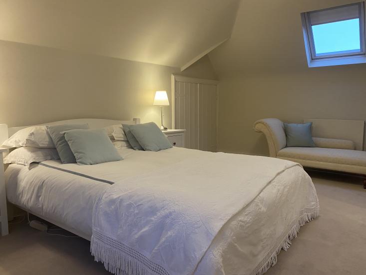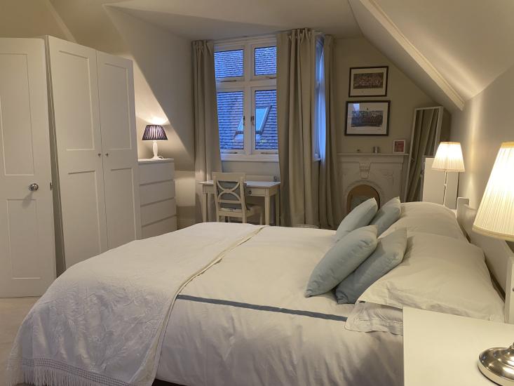 Large double bedroom (20ft x 12ft) available at top of our 7 bedroom Victorian house in Putney. The bedroom has a super king sized bed, desk & chair, chest of drawers, large wardrobe and chaise longue. You will have use of a large bathroom which has a Victoria & Albert bath, under floor heating and walk in shower. Towels, bath/shower mat, sheets provided and cleaning included.